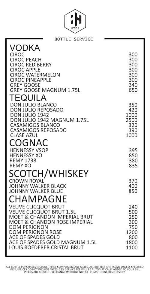 Hyde Social Toronto BOTTLE SERVICE Menu